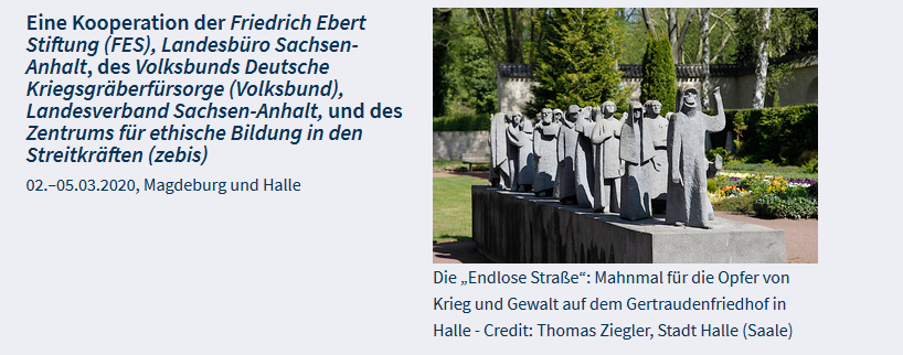 Das Landesbüro Sachsen-Anhalt der Friedrich-Ebert-Stiftung hat vom 2.-5.3.2020 eine viertägige Weiterbildung für ca. 40 Angehörige der Bundeswehr in Zusammenarbeit mit dem Zentrum für ethische Bildung in den Streitkräften (zebis) und dem Volksbund Sachsen-Anhalt veranstaltet. Zu Gast waren dabei unter anderen der Wehrbeauftragte des Deutschen Bundestages, Dr. Hans-Peter Bartels und Vertreter verschiedener Gedenkstätten wie Dr. Daniel Bohse (Leiter der Gedenkstätte Moritzplatz), Dr. Ute Hoffmann (Leiterin der Gedenkstätte für Opfer der NS-Euthanasie Bernburg), Michael Viebig (Leiter der Gedenkstätte Roter Ochse) und Dr. Kai Langer (Leiter der Stiftung Gedenkstätten Sachsen-Anhalt).