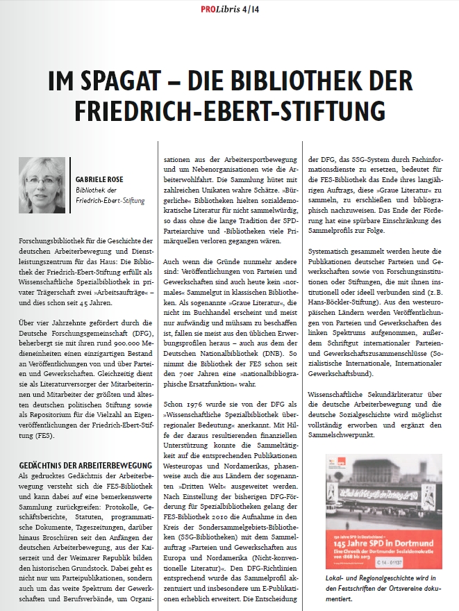 Im Spagat - die Bibliothek der Friedrich-Ebert-Stiftung. In: ProLibris 2014,4, S. 174-177.
