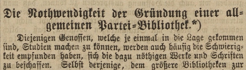 Die Wurzeln der "alten" Partei-Bibliothek reichen bis Sommer 1877, als August Bebel und August Geib in einem Gespräch die Idee einer Parteibibliothek entwickelten. Diese Idee brachte Bebel im Februar 1878 in Form eines Gründungsaufrufs im Vorwärts an die Öffentlichkeit, mit recht modernen und detaillierten Forderungen zu Status und Sammlungsauftrag der Bibliothek.