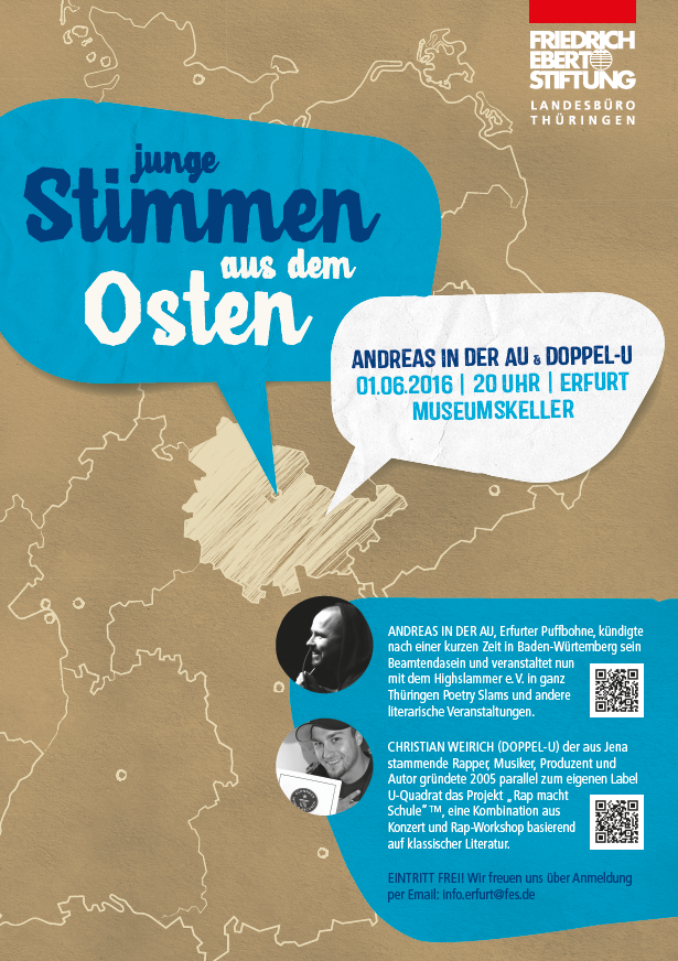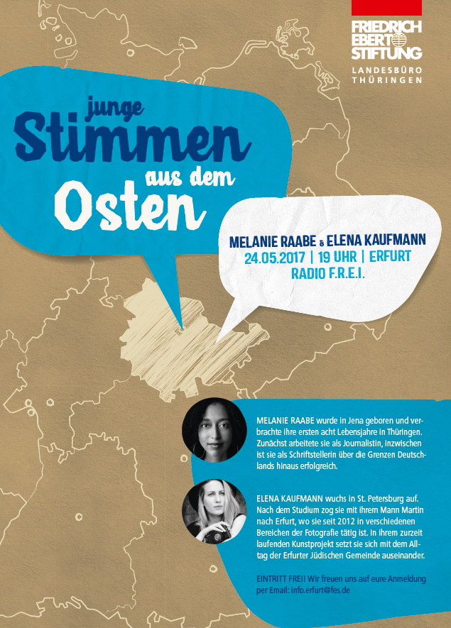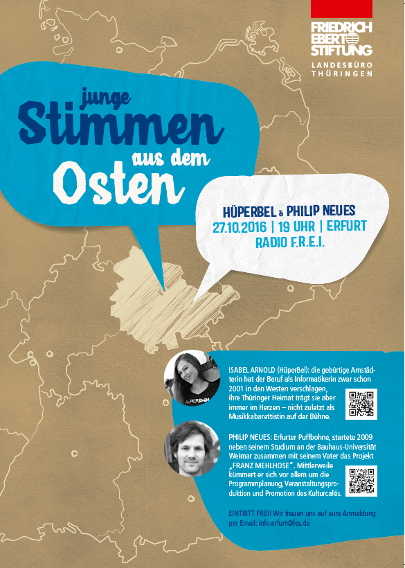 Bei „Junge Stimmen aus dem Osten“ laden wir Menschen zwischen 20 und 40 Jahren ein und kommen mit ihnen und unserem Publikum in lockerer Runde bei Salzstangen und Bier ins Gespräch. Unsere Moderatorin Diana Lehmann diskutiert mit immer zwei Gesprächspartner_innen über Thüringen, Ostdeutschland und das eigene Engagement. Hin und wieder "unterbrechen" wir dieses Gespräch, wenn unsere Gäste etwas lesen, vortragen, dichten, singen oder präsentieren.