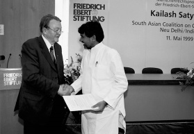 Die Friedrich-Ebert-Stiftung ehrte am 11.Mai 1999 Kailash Satyarthi für seinen unermüdlichen Einsatz gegen Kinderskalverei in Südasien. Im Jahr 1980 wurde er als Generalsekretär der „Bonded Labour Liberation Front“ gewählt und setzt sich seither dafür ein, dass soziale Ungerechtigkeit und Sklaverei, speziell die von Kindern, abgeschafft wird. 1989 ist er Mitbegründer des Südasiatischen Bündnisses gegen Kindersklaverei (South Asian Coalition on Child Servitude - SACCS). Das Bündnis umfaßt über 470 Partnerorganisationen in Indien, Pakistan, Nepal, Bangladesh, Bhutan und Sri Lanka. Seit 1992 fungiert er als Vorsitzender der SACCS. Kailash Satyarthi ist maßgeblich daran beteiligt, dass 1994 das 'Rugmark'-Kontrollsiegels eingeführt wird, welches Produkte kennzeichnet, die aus überprüften Betrieben ohne Kinderarbeitende stammen. Des weiteren wurden aufgrund des Engagements von Kailash Satyarthi die Rehabilitationszentren 'Mukti Ashram' in Delhi und 'Bal Ashram' in Jaipur für ehemalige Kindersklaven erbaut. Inzwischen sind 18 Bildungszentren in verschiedenen Staaten Indiens eröffnet worden. Im Jahr 1998 organisierte er den "Weltweiten Marsch gegen Kinderarbeit", der über eine Landstrecke von 80.000 Kilometern durch Asien, Afrika, Amerika, Australien und Europa führte und in Genf endete. Dort sprach Satyarthi im Juni 1998 vor der 86. ILO-Konferenz.