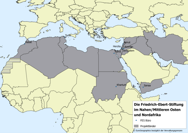 Seit Beginn der 1960er Jahre setzt sich die Friedrich-Ebert-Stiftung (FES) in der Region des Nahen/Mittleren Ostens und Nordafrika für die Werte und Ideen der sozialen Demokratie ein. Sie verfügt über ein Netzwerk von 11 Auslandsbüros, die Projekte in 14 Ländern der Region umsetzen. In diesen Büros arbeiten 15 entsandte deutsche Kolleg_innen gemeinsam mit 104 Mitarbeiter_innen aus den jeweiligen Ländern für die FES. In der Zentrale in Berlin, im Referat Naher/Mittlerer Osten und Nordafrika, sind 13 Kolleg_innen tätig.